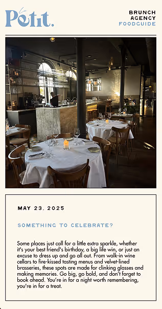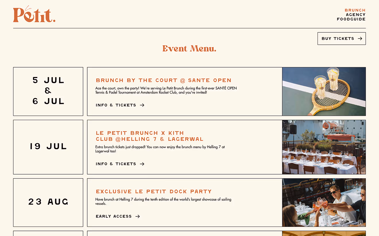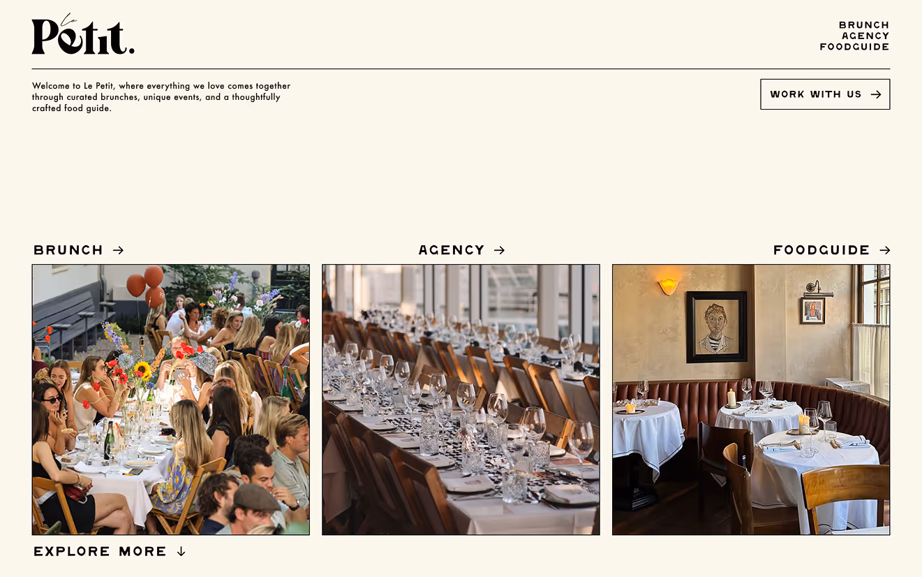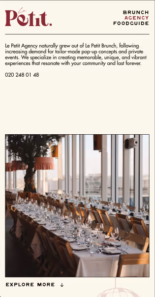 Le Petit is all about bringing people together through FOOD: From unforgettable pop-up brunches to tailor-made events and a curated food guide that inspires your next bite. Founders Wendele and Demi expanded their brand into three pillars, which we seamlessly brought together into one platform.Creating the Le Petit website was a feast of its own: designing a digital space that feels just as vibrant, inviting, and full of flavor as their journey.