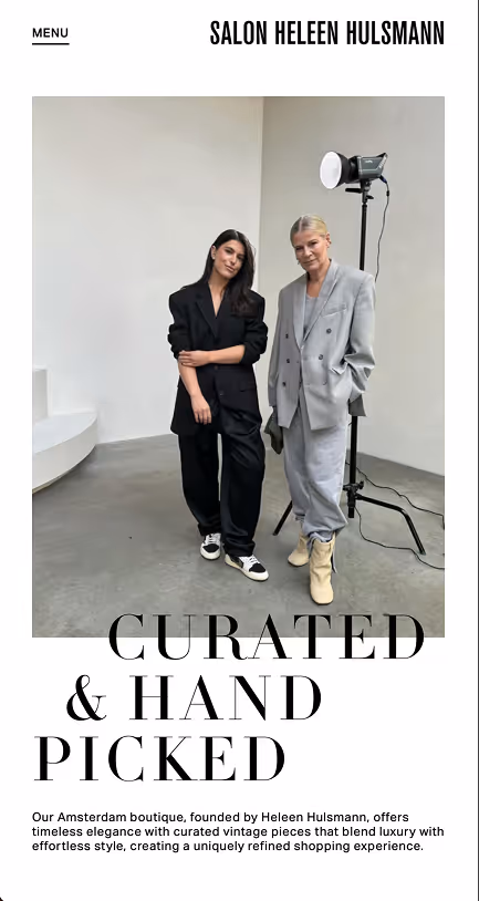 In close collaboration with Salon Heleen Hulsmann, we created a new way to experience pre-loved designer pieces online. Through refreshed visual branding, custom web design, and development, we designed a digital showroom that mirrors the feeling of stepping into the salon itself, intimate, curated, and effortless. No endless scrolling, just timeless items presented with care. Salon Heleen Hulsmann is more than a store; it’s a destination where personal styling and a deep appreciation for fashion come together.